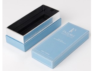 化妝品圍邊禮盒采用157g銅版紙裱1000g灰板,單色印刷,商標(biāo)燙銀,圍邊用銀光紙裱灰板。化妝品盒整體采用淺藍(lán)色作為紙盒主打色,加上銀色LOGO和盒邊白色的邊沿線搭配,清新,簡約。化妝品盒包裝設(shè)計采用成型的EVA內(nèi)托,與產(chǎn)品完全吻合,固定產(chǎn)品起到起到緩沖的作用。