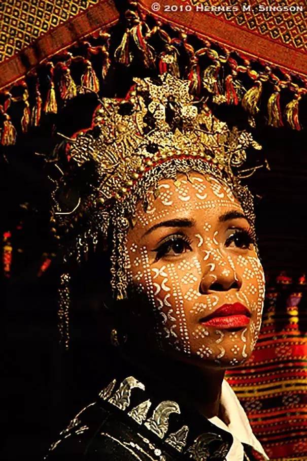 這是菲律賓Yakan民族的傳統(tǒng)服飾。他們婚禮分為兩場,分別是伊斯蘭式和古老的傳統(tǒng)儀式。臉上的圖案是吉祥的象征。