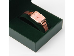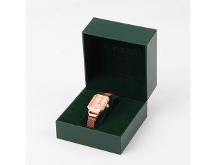 此款手表包裝盒采用了PU皮包膠胚,內(nèi)置白色EVA內(nèi)托,可用于手鏈或手表的包裝手表盒設(shè)計(jì)整體采用了紅色作為盒子主打色,可以很好的吸引消費(fèi)者的注意。手表盒四邊金黃色的線條邊沿與紅色搭配給人一種很強(qiáng)的視覺沖擊感,華麗而不沉悶。