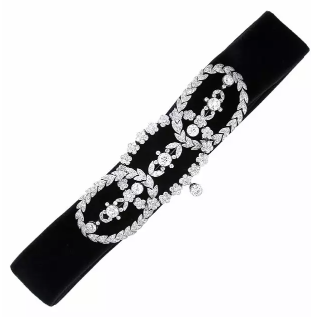 典型的代表是寬領(lǐng)式項鏈,這種圍頸式項鏈由維多利亞時期的薄紗變成了黑天鵝絨底襯或者有別扣的絲帶,中間裝飾著花朵或者帶扣,有時候也是單純鉑金鑲嵌,上面加上珍珠以及鉆石點綴,這不是現(xiàn)在流行趨勢正猛的“狗帶”嗎?