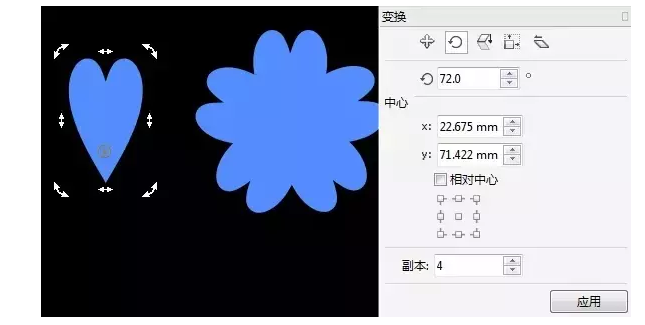 設(shè)計(jì)服裝吊牌的第二步: 旋轉(zhuǎn)復(fù)制 雙擊“矩形工具”繪制同文檔相同大小矩形, 為了方便我們看,將矩形填充為黑色,在工具箱中選擇“基本形狀”組中“完美形狀”中的“心形”圖案,繪制心形,復(fù)制旋轉(zhuǎn)心形角度,如圖所示。