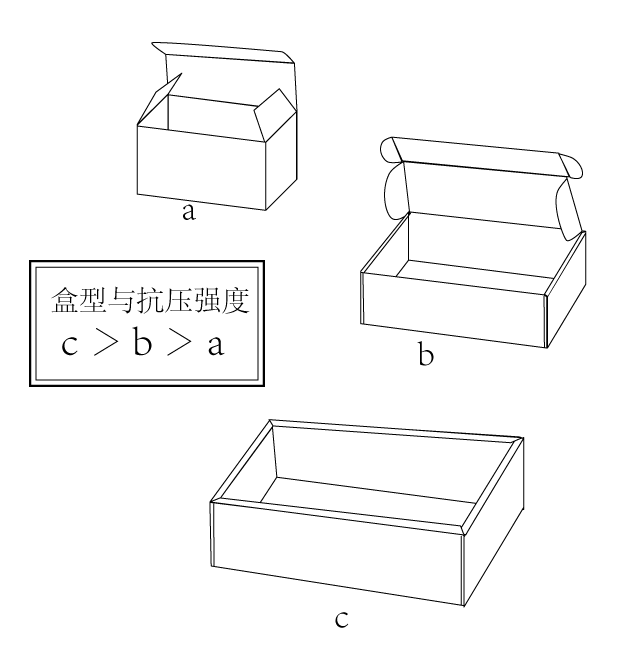 不同的盒型抗壓強(qiáng)度不同,我們常常根據(jù)產(chǎn)品的重量、及盒子的功能(物流包裝、銷售包裝)來(lái)設(shè)計(jì)不同的盒型滿足客戶對(duì)抗壓強(qiáng)度的需求。