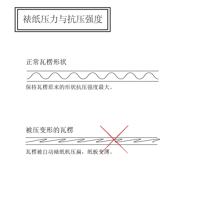 有的客戶希望不希望盒子的切面看見瓦楞,也有工廠裱紙師傅為了防止裱合不良,過分加大壓床的壓力、或者膠水輥的壓力,導(dǎo)致瓦楞被壓變形,犧牲了瓦楞紙盒的抗壓強(qiáng)度,對(duì)此包裝印刷廠家在裱紙的環(huán)節(jié)應(yīng)該提醒工人不要過度用力按壓瓦楞。