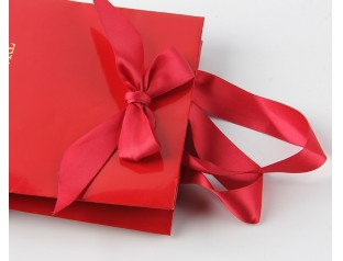 紅色在中國算是最受歡迎的顏色了,代表著喜慶、大氣,有留意的話會發(fā)現(xiàn),很多中國的珠寶商都喜歡用紅色來做珠寶的包裝、陪襯,紅色的珠寶首飾紙袋當然也少不了。這款禮品紙袋使用雙銅紙為主要材料,袋子表面logo使用精美的燙金工藝,凸顯品牌質(zhì)感;拎手選用了絲帶,這個袋子的手拎特別有意思,不是跟其他的紙袋那樣打結(jié)或者這膠封,而是采用在外面打蝴蝶結(jié)的方式,不僅固定住了拎手,而且還裝飾了紙袋,一舉兩得。袋身由紅色專色印刷而成,做工精細,印刷精美,尺寸可按需求定制。