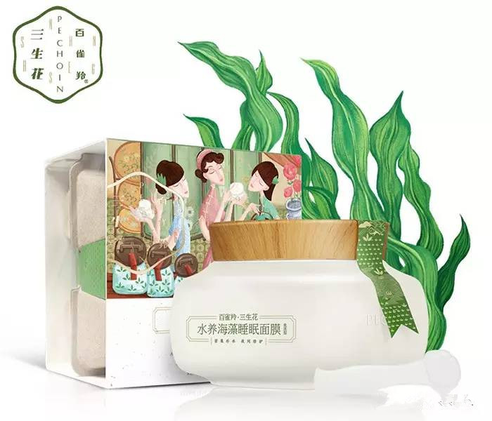 2012年,百雀羚旗下還有一款名為“百雀羚·三生花”的子品牌,延續(xù)了品牌一貫“東方美學(xué)”的理念,化妝品包裝上的三個插畫形象分別代表了三種珍貴的護(hù)膚草本植物:三色堇、山茶花、金釵石斛。畫面里是貓咪一樣迷之傲嬌+優(yōu)雅的美人。想當(dāng)初小編開始用面膜,在購買面膜的時候就是因為看上了百雀羚的這化妝品盒才成為了它的粉,當(dāng)然,現(xiàn)在也還在用。