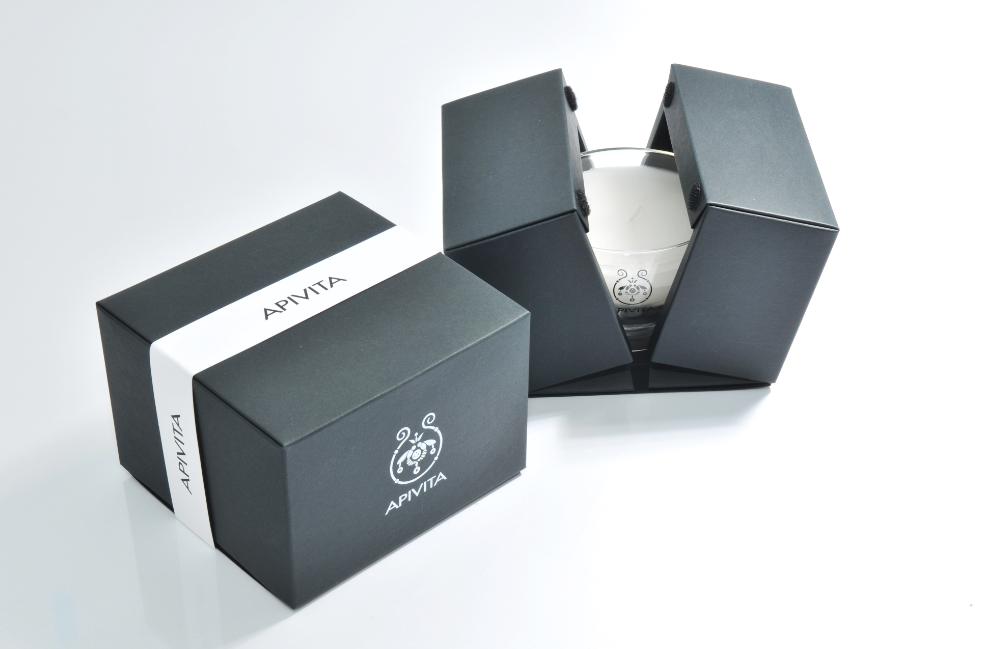 APIVITA香薰蠟燭包裝,黑色卡紙的盒型結(jié)構(gòu)比例合理、結(jié)構(gòu)嚴(yán)謹(jǐn)、造型簡(jiǎn)單精美,突顯出盒型的形態(tài)與材質(zhì)美,力求達(dá)商品保護(hù)并襯托出透明蠋臺(tái)的層次感,左右開盒的禮盒效果展現(xiàn)商品驚喜的價(jià)值感。