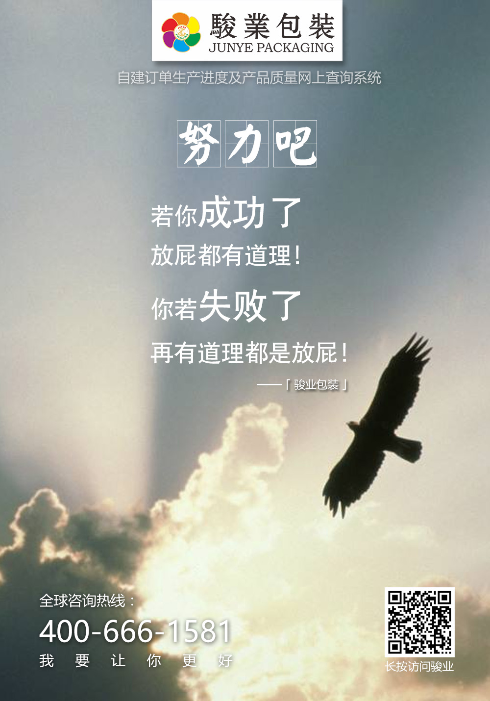 都說成年人的世界里從來沒有容易二字,在這個鋼筋水泥森林里,我們就像一個沒有根的蒲公英在這個城市里飄著,搖擺不定的生活,人來人往,我們每天接觸到各種不同的人,被不同的“氣場”給包圍著,其實人很容易被周圍的事物影響,或許在來上班的路上剛好聽到一個人在抱怨生活,那么可能你也會覺得生活不易,從而一整天郁郁寡歡,所以為了不讓駿業(yè)包裝的小伙伴們帶著負(fù)能量工作,駿業(yè)包裝的小張為大家每天準(zhǔn)備了一點正能量的雞湯,不用客氣,大家一起來干了這篇雞湯吧!
