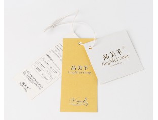 此款服裝吊牌制作采用了400g銅版紙,雙色印刷,商標(biāo)燙金。服裝吊牌設(shè)計采用了小清新的風(fēng)格,整體以白色為主,搭配黃色,簡約,大方。吊牌設(shè)計商標(biāo)燙金,醒目的燙金LOGO,更彰顯其品牌價值。