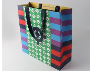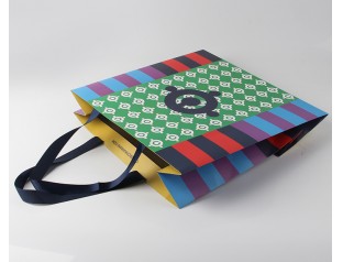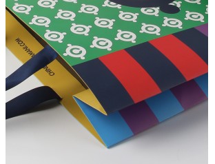 此款手挽紙袋采用250克單銅紙四色印刷過啞膠,不打孔粘扁繩。小清新條紋手提紙袋,環(huán)保美觀、精致耐用。深藍(lán)色的絲帶作為手提紙袋的手提繩,高檔大方。想了解更多的手提紙袋,歡迎致電廣州駿業(yè)包裝廠
